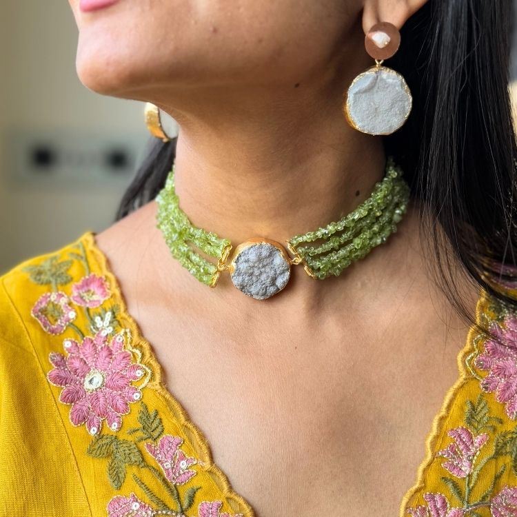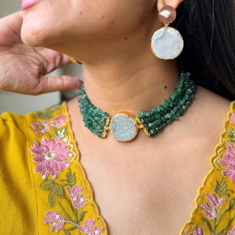 Grand Dark Green Layer Necklace Set with Floral Dangler Earrings